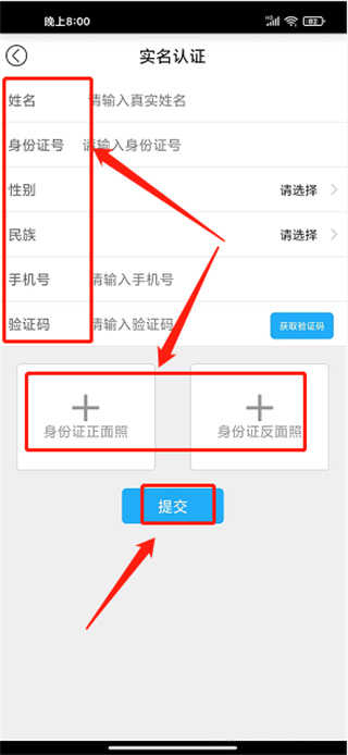 在实名认证页面填写姓名、身份证号、性别、民族、手机号码、验证码,并上传证件照片后点击【提交】完成认证流程。