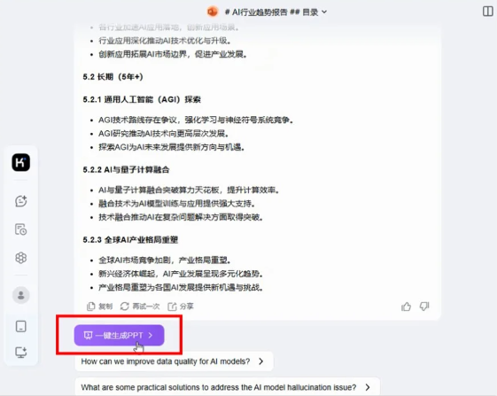 4、将之前生成的内容复制粘贴到此处,然后点击一键生成PPT”按钮。