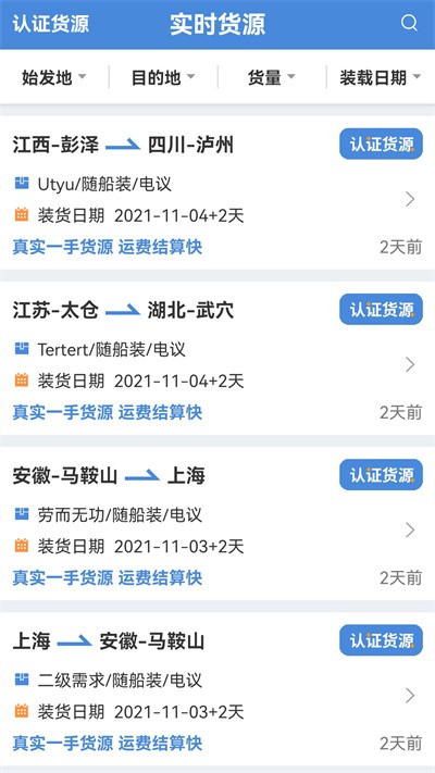 2、登录后进入实时货源页面,可根据始发地等条件筛选货源信息。