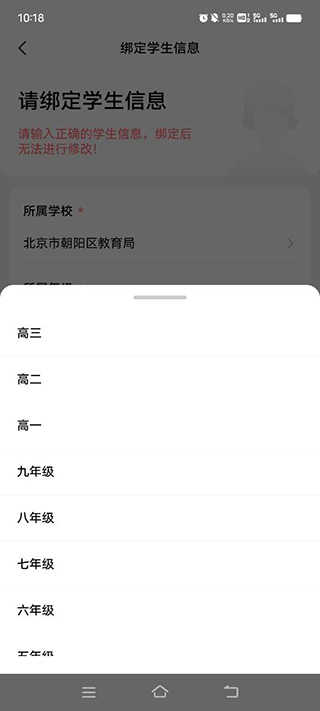 3、选择当前就读年级,请仔细核对信息,一旦绑定短期内将无法更改