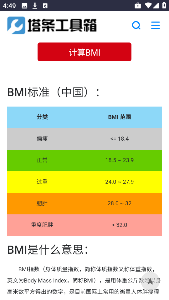 4、继续向下浏览,还能查阅关于BMI的标准范围信息。
