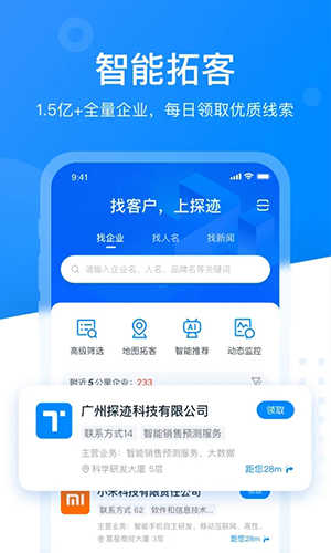 探迹拓客是一款功能强大的手机软件,通过Ai智能外呼和NLP技术的结合,实现了快速量化客户画像和快速找到客户联系方式的目标。该应用具有全方位剖析企业、精准获客、降低获客成本等特点,为用户提供了一个客户专属的通讯录和全方位的价值观。用户在使用过程中不仅能高效触达海量客户,还能实现一次外出实现多个客户拜访,从而提升工作效率和销售业绩。