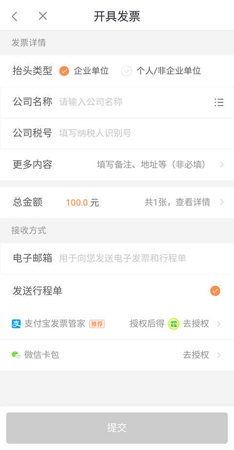 4、选择目标订单,填写正确的发票抬头与邮箱地址,最后提交申请。