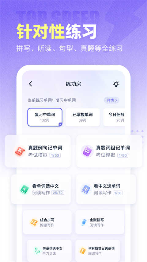 支持看中选英、看英选中、听音辨义、拼写测试、英文释义选择、跟读单词和句子等多种训练模式。