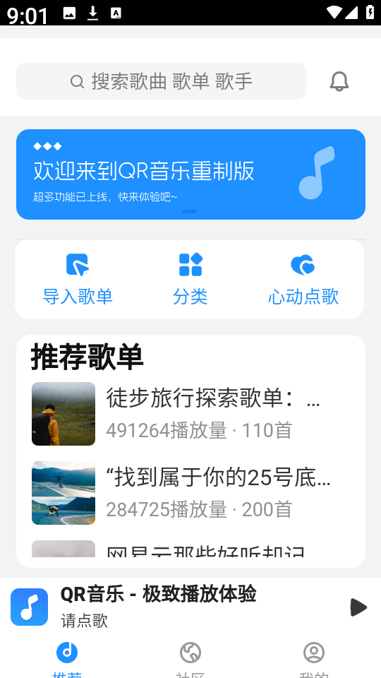 1、下载并安装QR音乐app后,启动应用进入主界面。