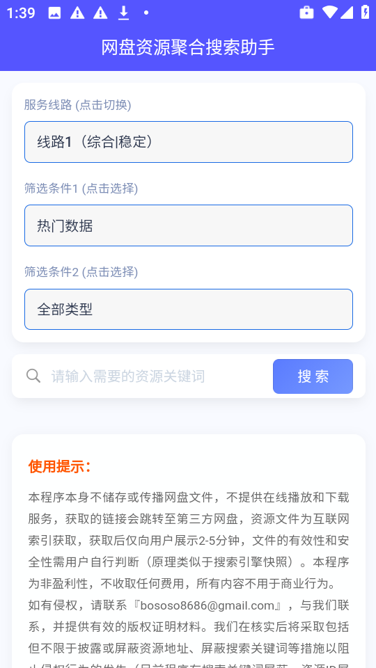 网盘资源聚合搜索助手,不提供任何直接的在线播放或下载服务,仅通过互联网索引技术为用户提供第三方网盘链接。用户获取的链接将自动跳转至外部平台,且展示时间限制在2-5分钟内。所有功能均无需付费,完全免费使用。