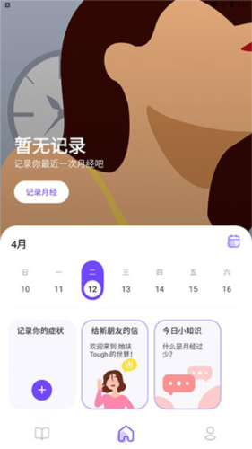 3、首页界面:提供月经记录、症状跟踪等功能入口,还有欢迎信和每日小知识供用户浏览。