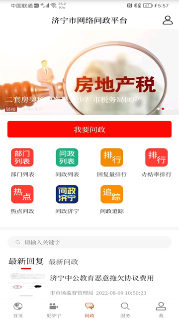 问政板块与济宁市网络问政平台”深度对接,实现用户数据互通、风格统一。用户可通过手机随时随地提交问题,并实时查询办理进度,对处理结果进行评价,提升互动体验。