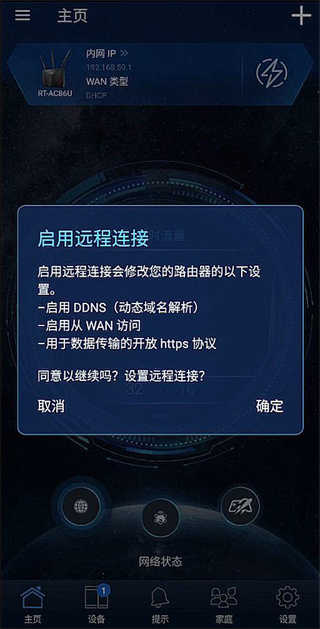 12、进入路由器设置页面后,会提示启动远程连接”,若需要在外网通过华硕路由器APP访问路由器设置页面请点击确定”