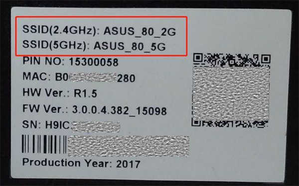 7、路由器默认的网络名称可以在路由器机身贴纸上看到 SSID: ASUS_XX (如下图红框处)