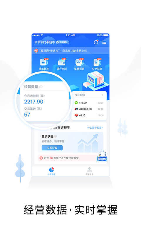 收款账本实时看,、支付宝、云闪付统一对账,银行卡余额明细数据实时查,简化商家对账工作
