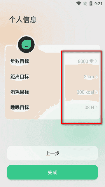 3、设置好步数目标,距离目标,消耗目标和睡眠目标等内容。