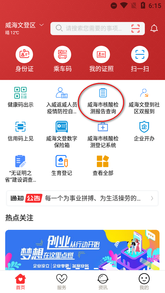 2.进入爱山东”APP后,点击首页左上角选择进入【威海文登区】【威海市核酸检测报告查询】进入查询服务。