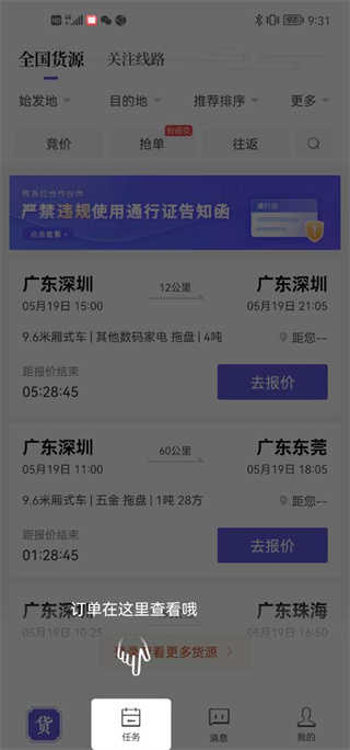 跨越运力app司机端汇聚了众多优质企业客户,每日提供海量订单供司机挑选。司机可根据自身条件参与竞价,雇主则依据报价与好评率选择合适的承运方,双方达成一致后即可执行任务。