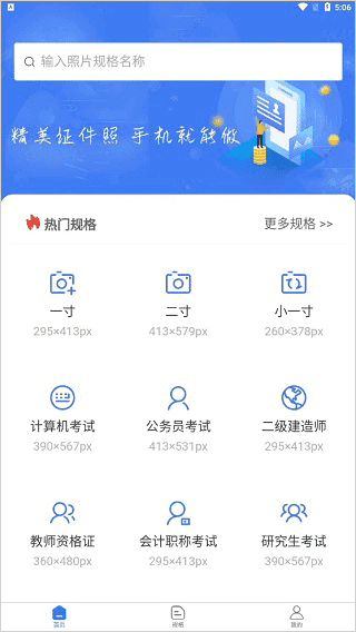 5、支持多种常用照片规格,如一寸、二寸、社保照、计算机等级考试报名照、公务员考试报名照等。