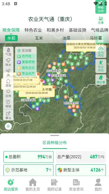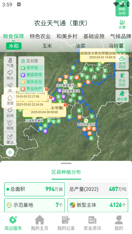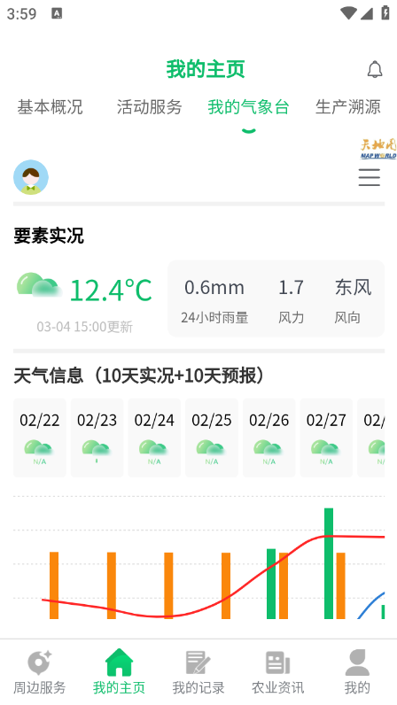 农业天气通是由重庆市气象科学研究所开发,以精细化农业气象服务为目标。针对农户、大型基地和涉农专家,集农业气象服务产品获取、农场精细化管理、一农户一主页、优质产品推介等功能于一体的农业气象专业服务APP。农业天气通将技术融入场景,通过智慧气象深入田间,让广大农业生产者和农业相关从业人员,能够便捷高效地获取更加权威、精准的天气预报信息,同时针对不同作物种类和生育周期进行全方位的跟踪气象服务,提供专业的气候分析,帮助农业从业者实现 靠天吃饭”向看天管理”的改变。