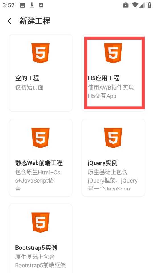5、任意选择一个你所感兴趣的工程,这里以H5应用工程”为例。