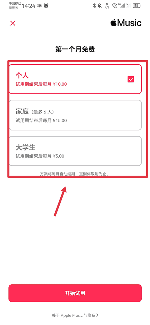 2、在音乐库界面内你可以看到免费使用apple music一个月,点击立即尝试