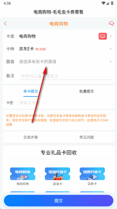 3、选择单张卡的面值点击提交即可
