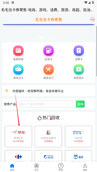 1、打开软件进入首页,点击下方卖卡