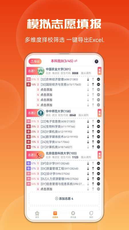 2、利用模拟填报功能,挑选心仪的院校进行尝试性填报。