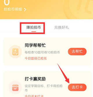 4、进入后,在赚拍拍币”页面点击去打卡”按钮。