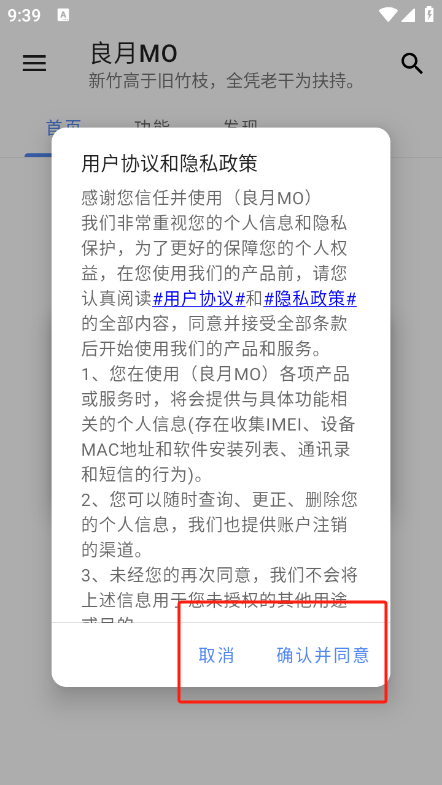 进入到软件首页,首先请同意用户协议和隐私政策