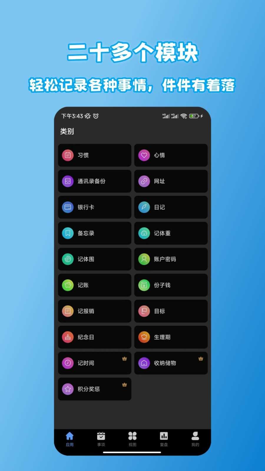 3.在功能模块页面,选择【记事件】功能,点击【+】即可