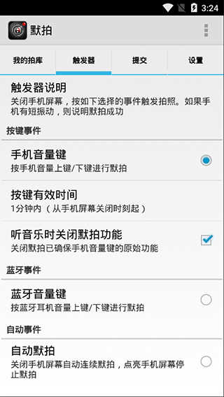 没错,默拍App正是这样一款能够在手机黑屏状态下实现拍照的应用程序。它能够依据你选择的触发条件(例如按键操作)进行拍摄,并按你的指令将照片存储或发送至指定位置。通过该应用拍摄的照片只能在默拍App内部查看,同时支持手势密码锁定,从而让这些照片成为你的私人珍藏。