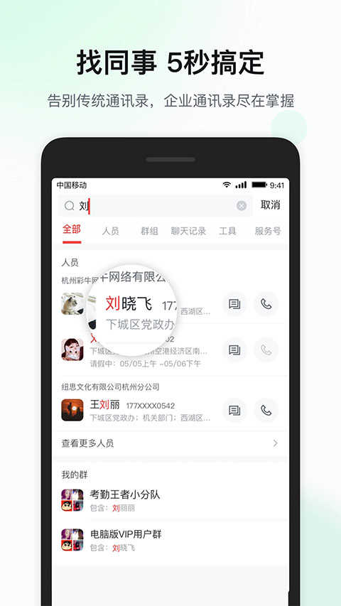 【通讯录管理】:整合企业组织架构和个人联系人,快速查找同事信息,提升工作效率。