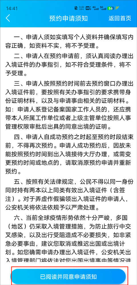 2、进入预约申请页面,仔细阅读相关信息后,点击下方的已阅读并同意申请须知”进入下一步;
