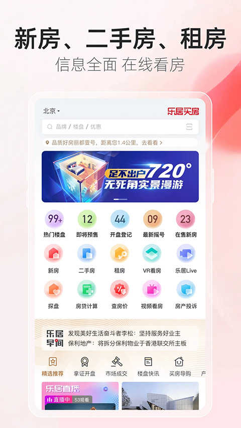 乐居买房app是新浪房产倾力打造推出的一款专业看房买房服务神器,该软件整合全网房产资讯,采用瀑布式房产信息流帮助购房者快速查询优质新房、二手房、列表地图找房,全方位对楼盘房源进行描述。购房者在平台内挑中项目后,可直接预约乐居码上专车,免费享受专车接送到售楼处,看房省钱又省心。