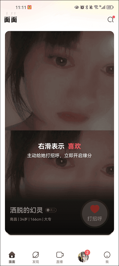 1、在首页中,用户可以通过右滑对异性表示喜欢,还可以跟异性打招呼。