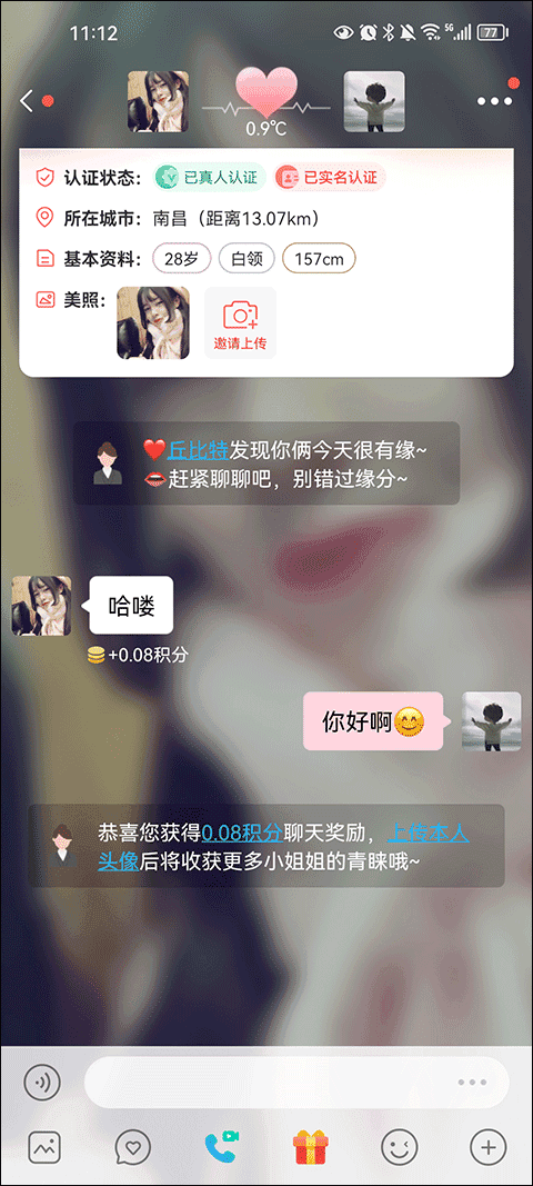 4、此外,在聊天的时候,还能有几率获得积分奖励,并且上传本人头像后将收获更多小姐姐的青睐哦。