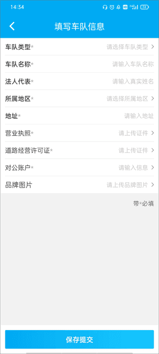 3、第二步是添加车队信息,选择车队类型、法人代表,上传营业执照,同样点击保存提交,然后继续填写车辆信息,按照提示填写、上传即可。