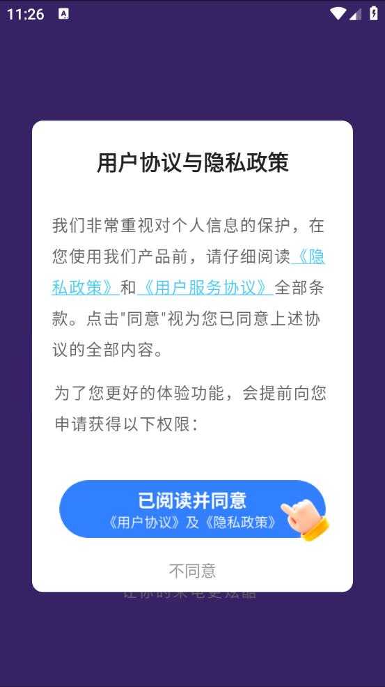 2、首次启动时,需要确认并接受相关的隐私政策条款。