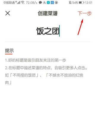 4、取名菜谱,点击【下一步】;