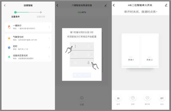 多设备联网操作:联网完成后,进入相关设备的控制界面,可轻松设置灯光的定时开关或一键全开全关等功能。此外,在智能”界面中,您还可以根据个人需求和喜好,设定个性化的场景模式与自动化任务,从而打造专属的智能家居体验。