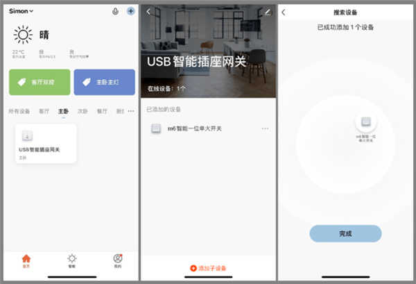 为了让设备联网更加快捷方便,无论是连接网关还是其他智能设备,整个过程仅需五分钟即可完成。在连接网关时,只需打开西蒙智享App并输入家庭Wi-Fi密码,M6 Smart双USB轻型网关便会自动完成网络配置。