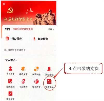 4. 在功能板块中选择党费交纳”,点击立即交费”。随后可通过或支付宝完成支付(如遇支付问题,可联系党支部管理员协助解决)。