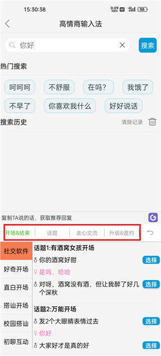 5、如下图所示,进入输入法主界面后,即可像普通输入法一样正常使用,同时还能便捷选取各类开场语和聊天话题。