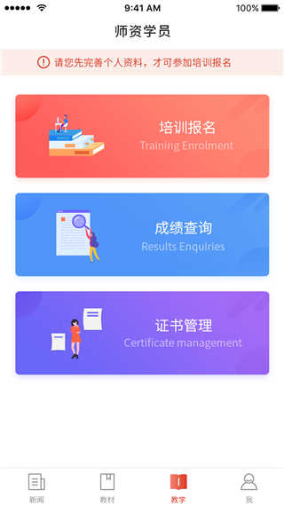 3、进入教学页面后,可查看师资学员的培训报名、成绩查询及证书管理等功能;