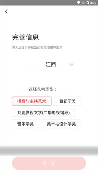 1、打开优艺考app后登录,完善个人信息(建议填写真实数据,以便系统根据你的实际情况进行个性化推荐);