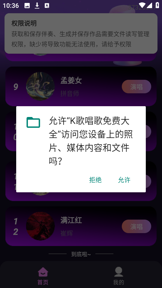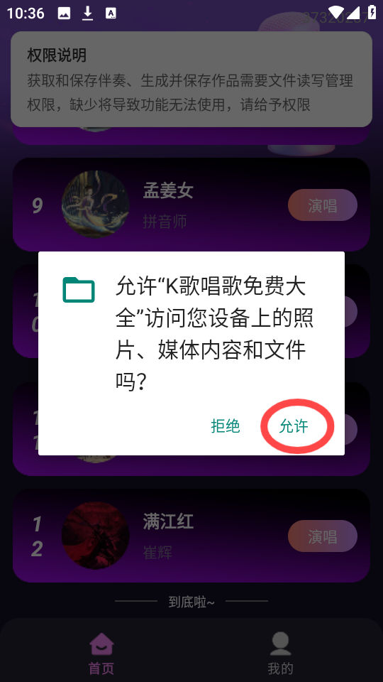 3、选择一首心仪的歌曲进行演唱,在首次使用演唱功能时,系统会提示你授权必要的权限。