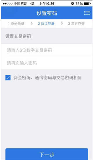 7、设置资金密码、通信密码及交易密码,建议默认保持一致以便记忆。