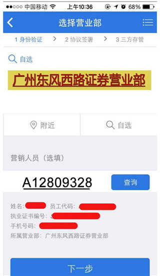 2、选择合适的营业部,既可就近选择,也可根据推荐查找对应营销人员。