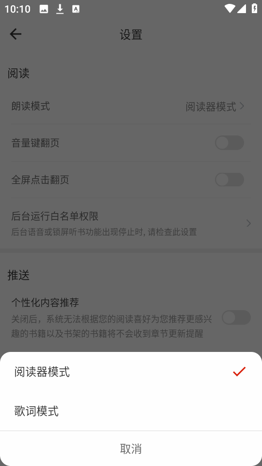 3、在这里,你可以自由切换朗读模式,包括阅读器模式与歌词模式等个性化选项。
