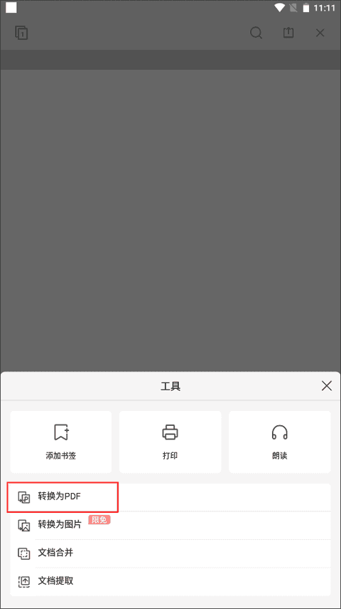 3、进入到文档内容设置页面,下方有很多的功能选项,点击下方右边的工具”,点击转换为PDF”,选择好后等待一会儿,页面就提示你已经转换成功了。