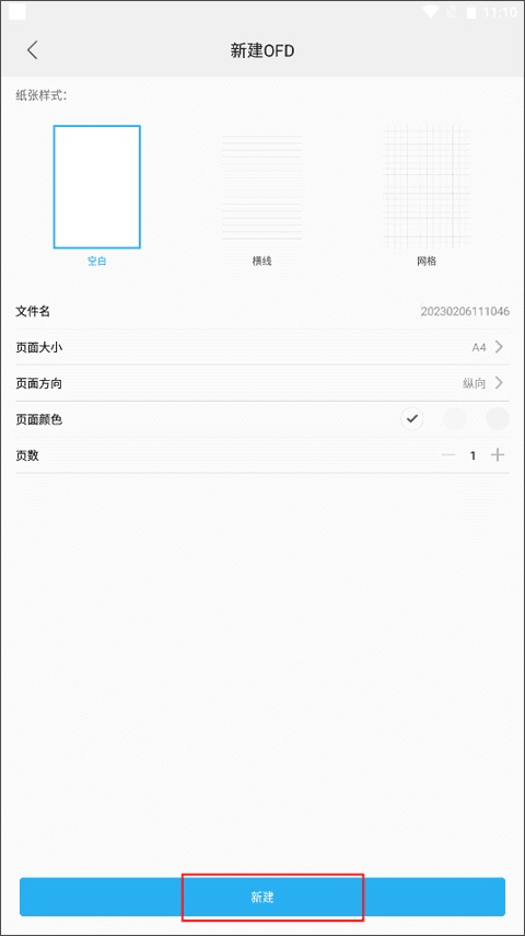 2、选择纸张样式,设置文件名、页面大小、页面颜色、页数等参数,设置好后点击下方的新建”。