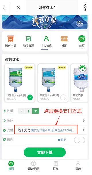 【预约订水】下班前预订饮用水,回家即可享受现成的纯净水源,极大节省时间。